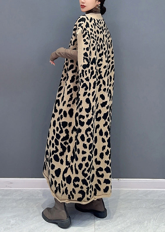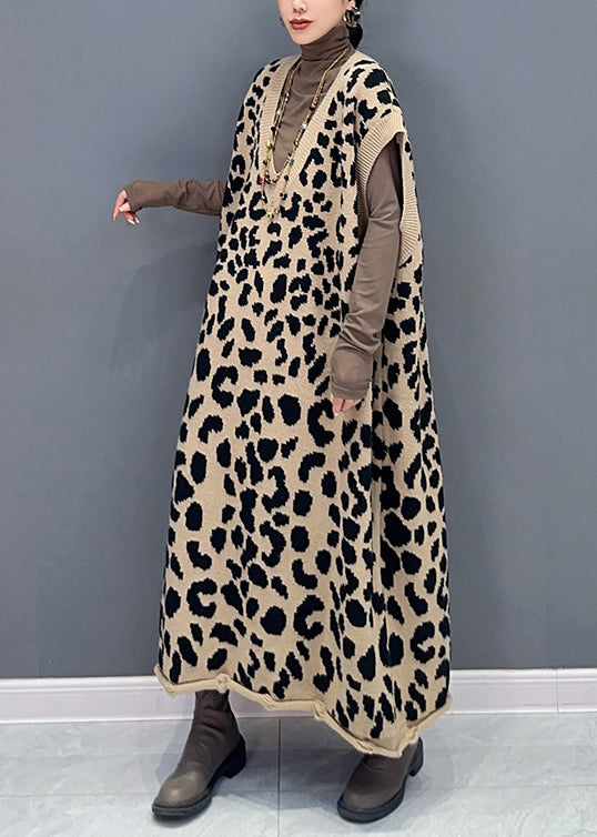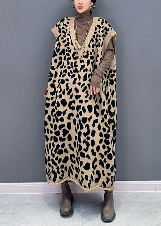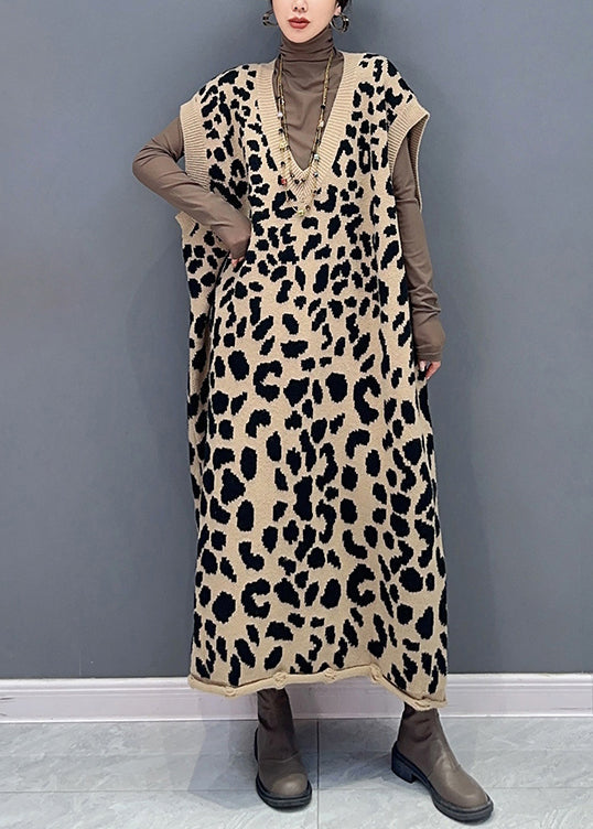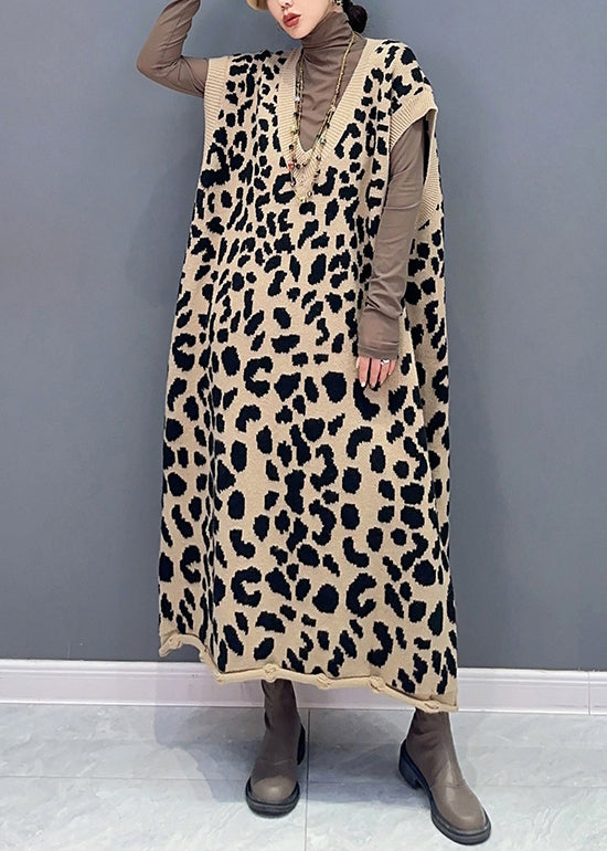Khaki Cozy Patchwork Cotton Knit Waistcoat Dress V Neck Sleeveless