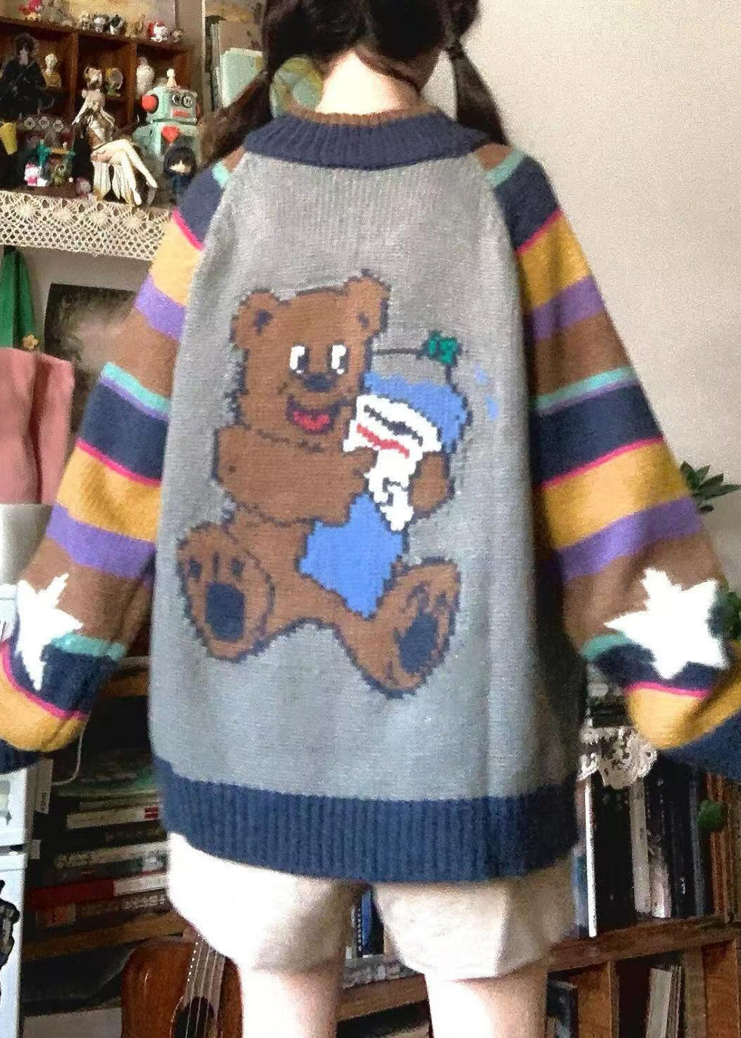 Loose Colorblock Zip Up Pockets Print Patchwork Knit Coat Spring