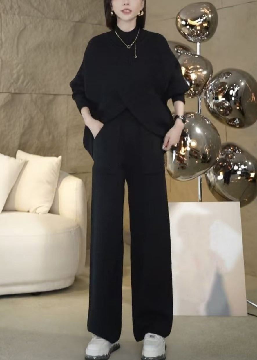 Loose Dark Gray Asymmetrical Sweaters And Pants Knit Two Piece Set Winter