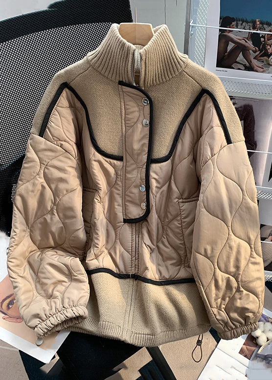Loose Khaki Zip Up Knit Patchwork Parka Long Sleeve