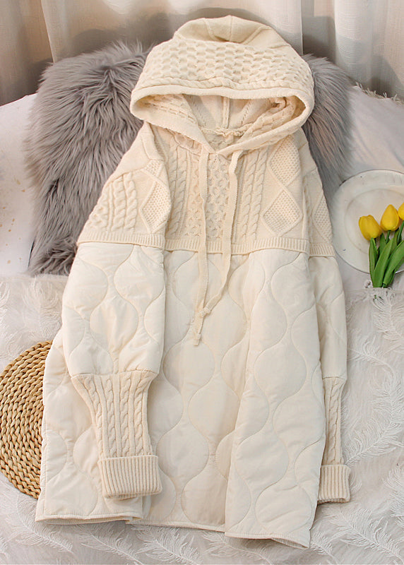 Loose Royal Blue Hooded Knit Patchwork Mid Parka Long Sleeve