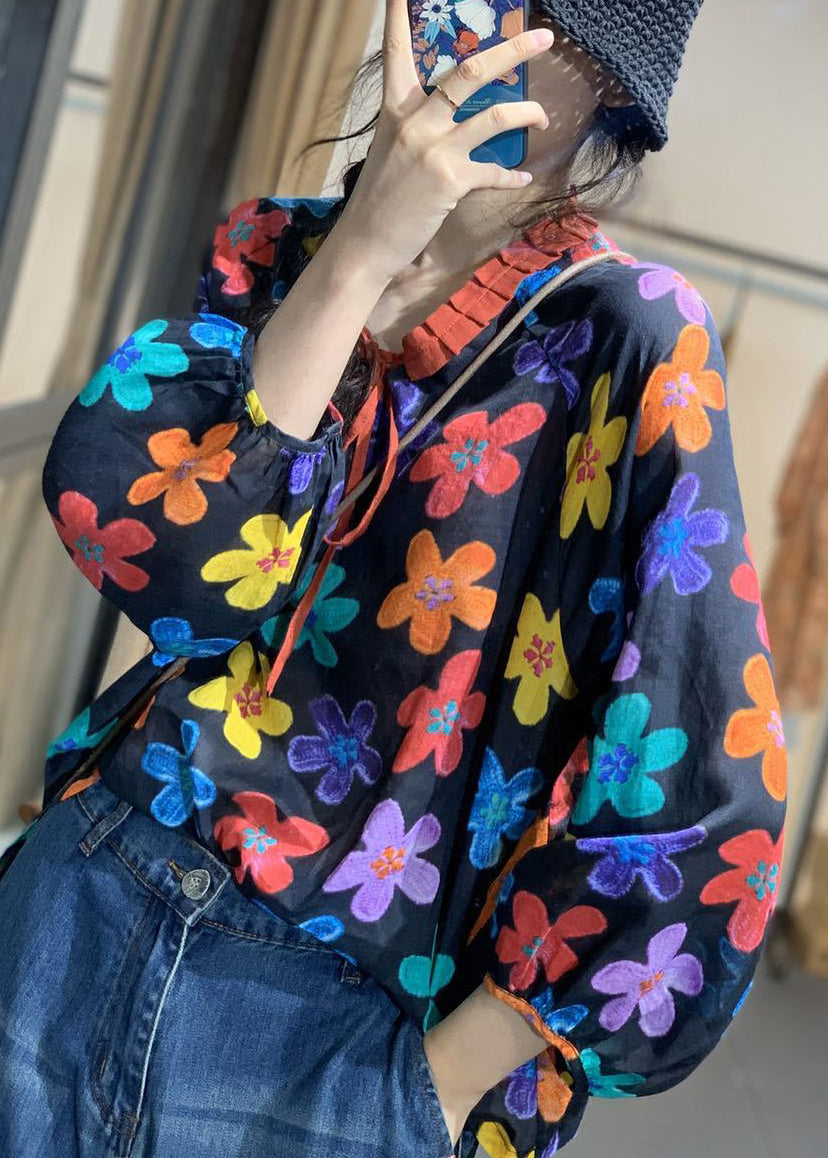 Loose Yellow Lace Up Print Cotton Top Long Sleeve