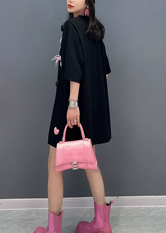 Modern Black O Neck Heart Print Cotton T Shirt Top Summer