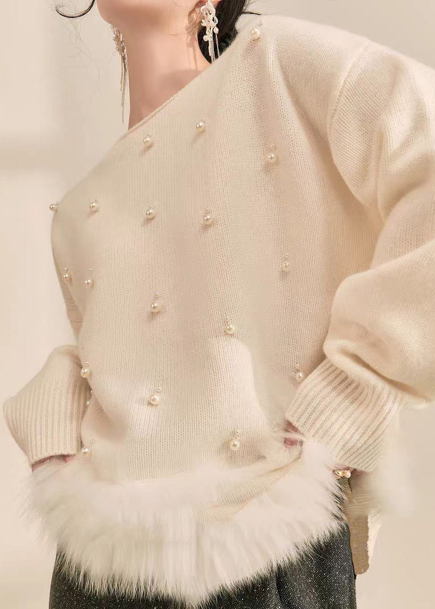Natural Grey Patchwork Nail Bead Fuzzy Fur Fluffy Cotton Knit Sweater Spring