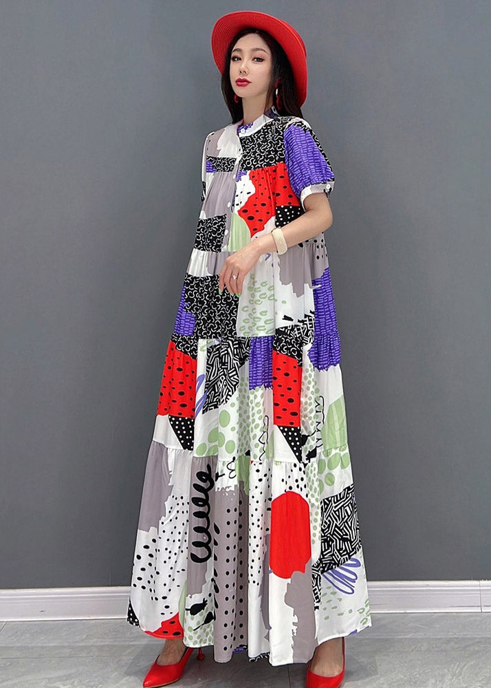Natural Red O-Neck Print Chiffon Ankle Dress Short Sleeve