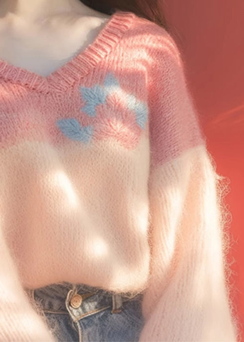 New Pink V Neck Patchwork Knit Sweaters Winter