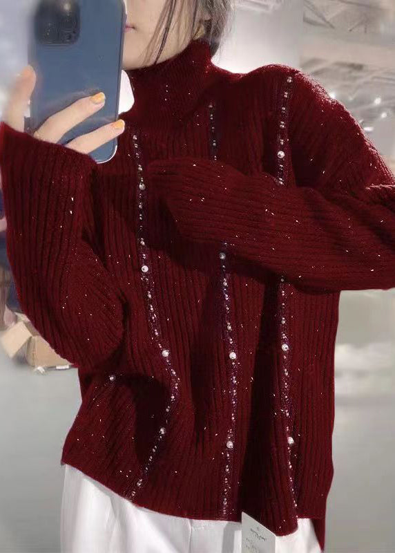 New Purple Turtleneck Nail Bead Patchwork Knit Sweaters Long Sleeve