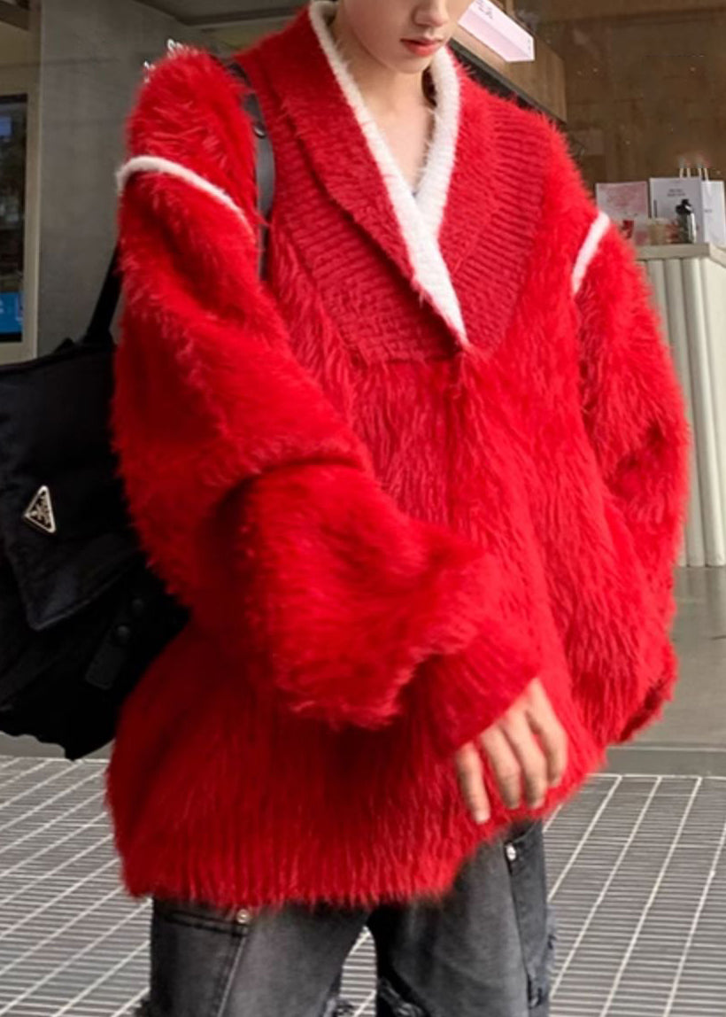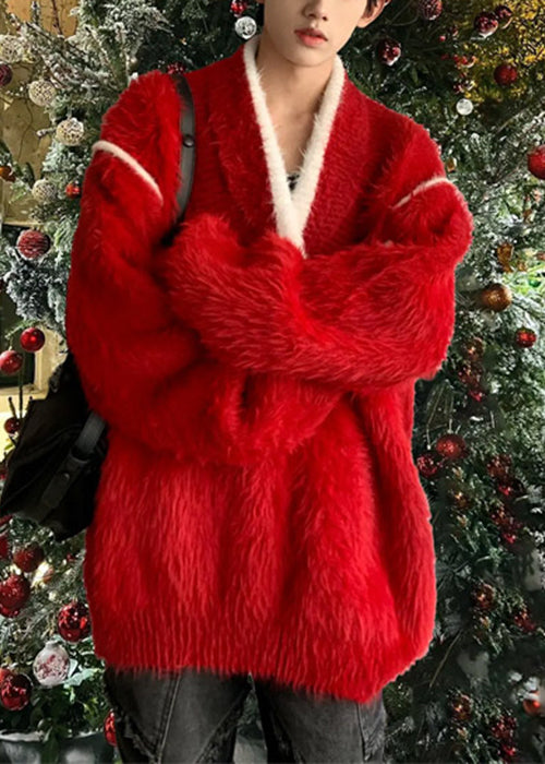 New Red V Neck Thick Patchwork Ma Hai Mao Men Sweaters Fall