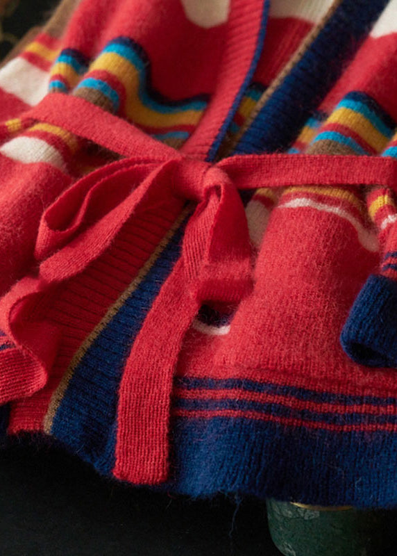 New Striped Tie Waist Pockets Patchwork Knit Cardigan Fall