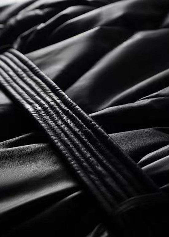 Simple Black V Neck Tie Waist Patchwork Sheepskin Duck Down Coat Winter