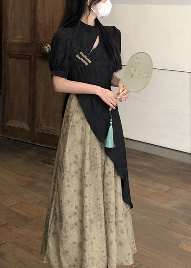 Stylish Black Stand Collar Print Patchwork Button Silk Maxi Dresses Puff Sleeve