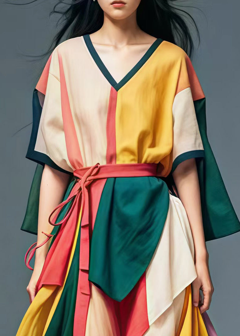 Stylish Colorblock V Neck Patchwork Tulle Ankle Dress Summer