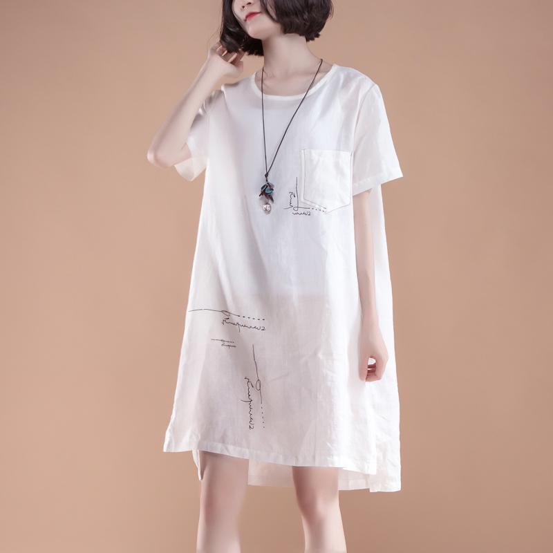 top quality linen cotton dress oversize High-low Hem Summer Short Sleeve Pockets slit White Dress