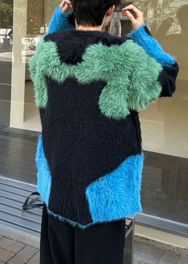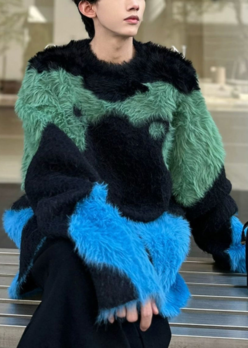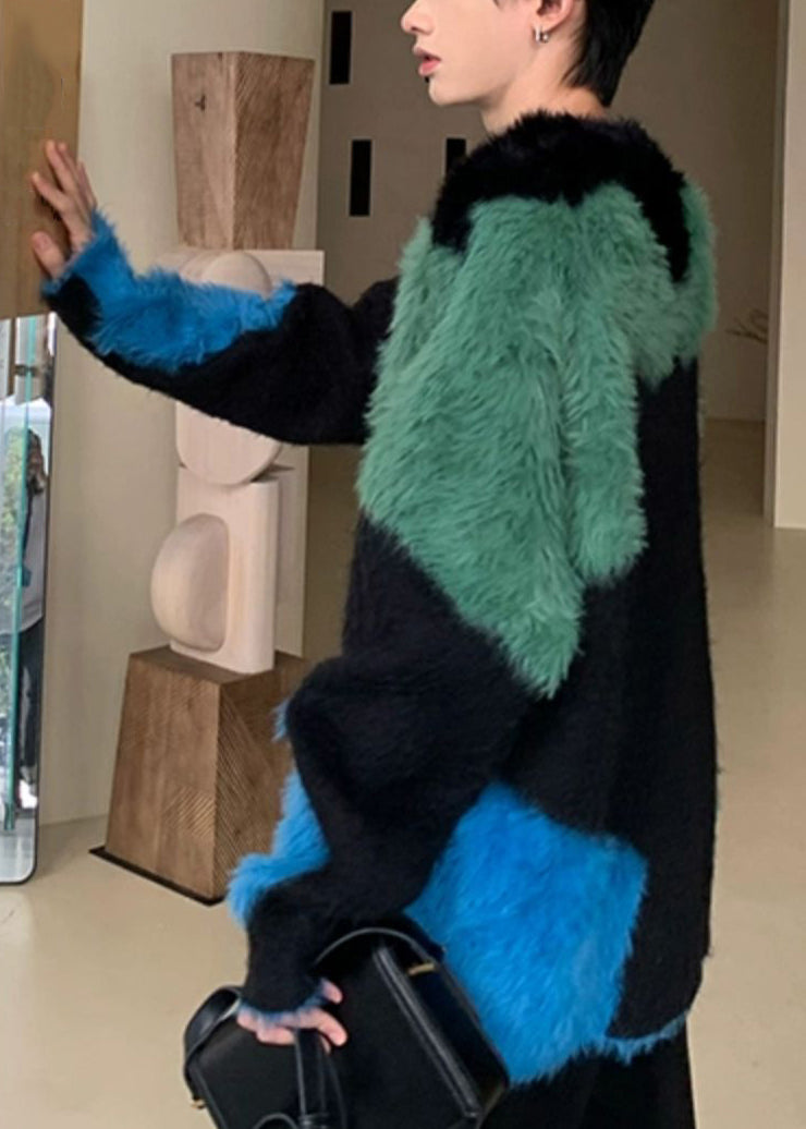 Unique Black Cozy Patchwork Mens Sweater Pullover Winter