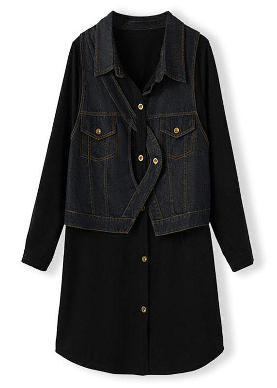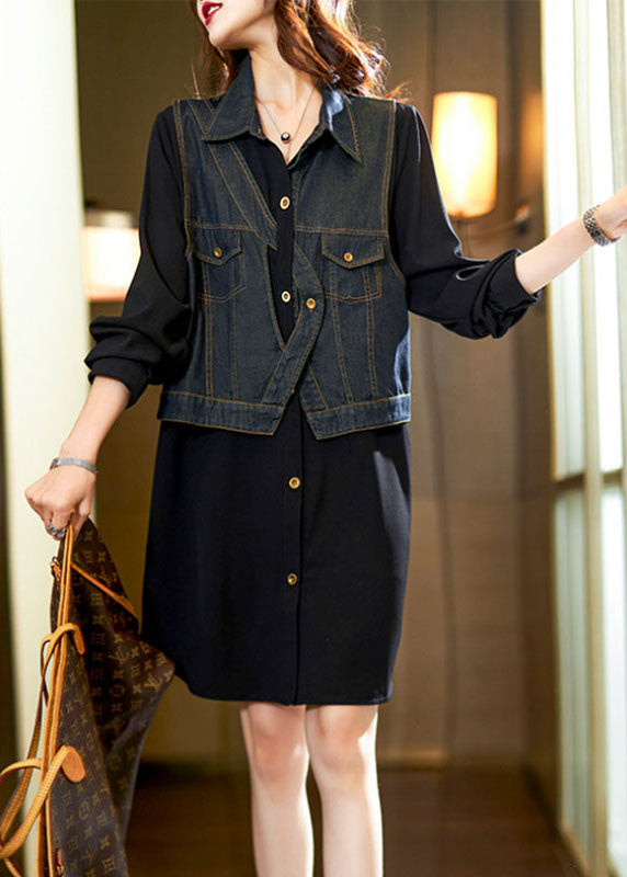 Vintage Black Square Collar Denim Patchwork Fake Two Pieces Mid Dress Long Sleeve