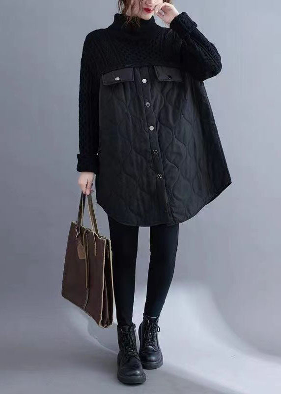 Vintage Black Turtle Neck Patchwork Knit Cotton Filled Long Sweater Winter