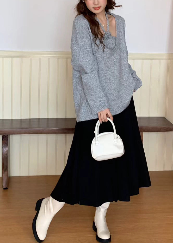 Vintage Grey Halter Floral Knit Pullover Two Piece Set Winter