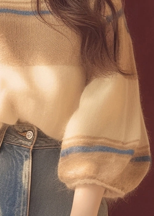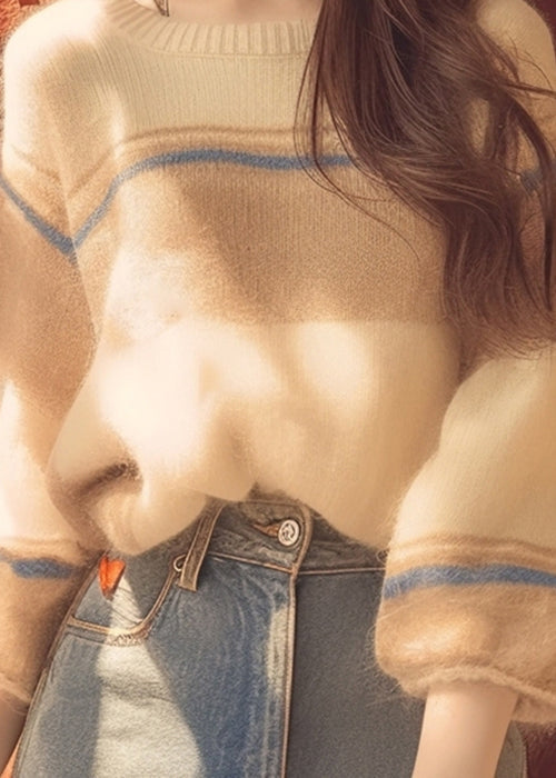 Women Apricot O Neck Cozy Patchwork Knit Sweater Winter