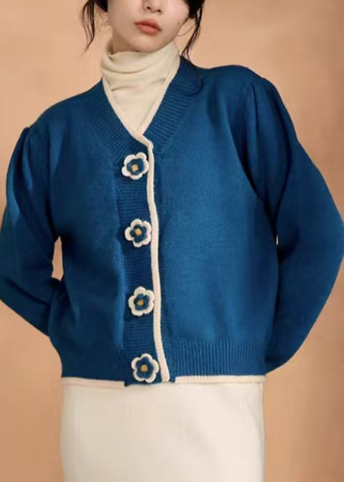 Women Blue V Neck Floral Knit Short Sweater Winter