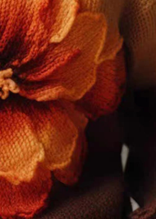 Women Brown O Neck Floral Patchwork Cotton Knit Sweaters Long Sleeve
