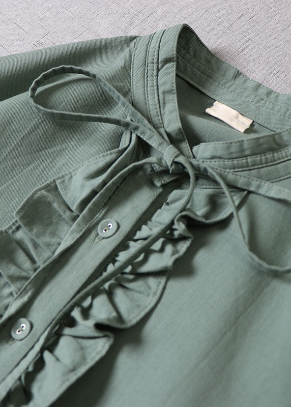 Women Tea Green Ruffled Button Cotton Dress Long Sleeve