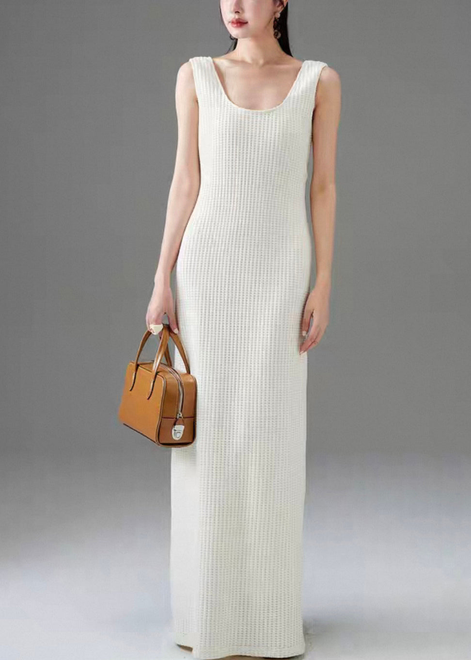 Women White Plaid Solid Cotton Long Dress Sleeveless