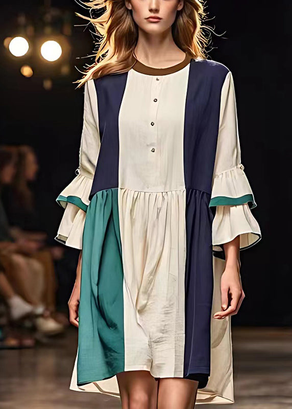 Art White O-Neck Patchwork Linen Dress Flare Sleeve