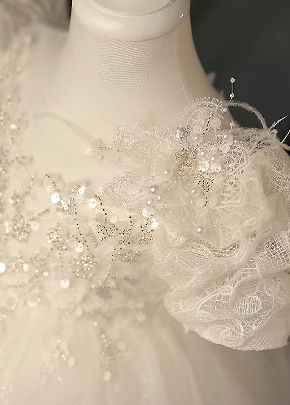 Beautiful White O-Neck Sequins Tunic Tulle Kids Maxi Dresses Summer