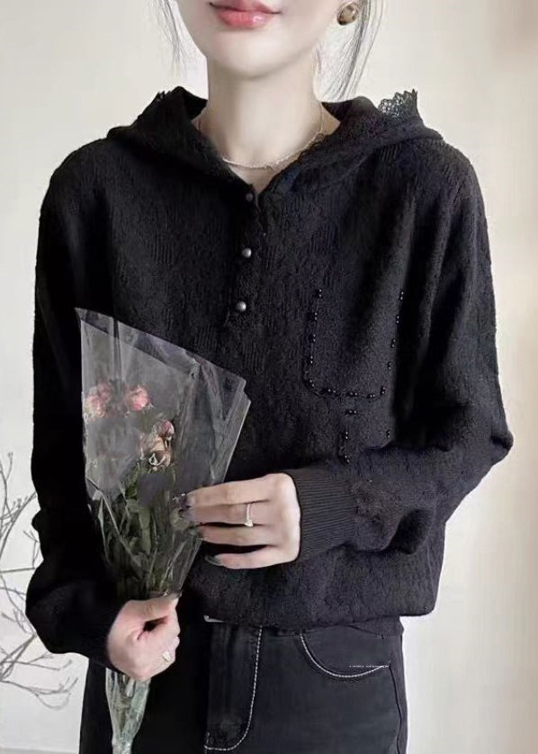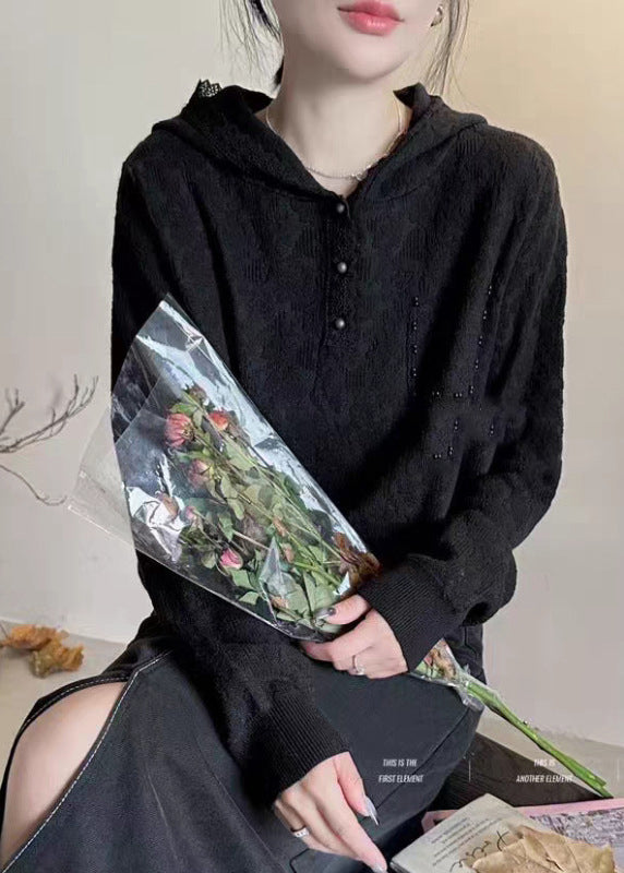 Bohemian White Pearl Pockets Hooded Cotton Knit Sweaters Lantern Sleeve