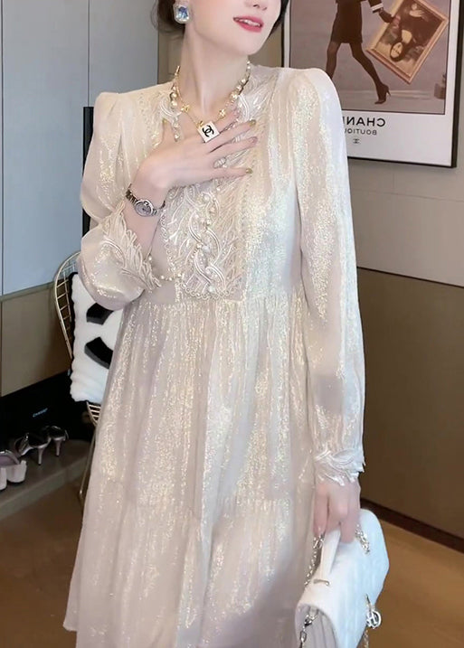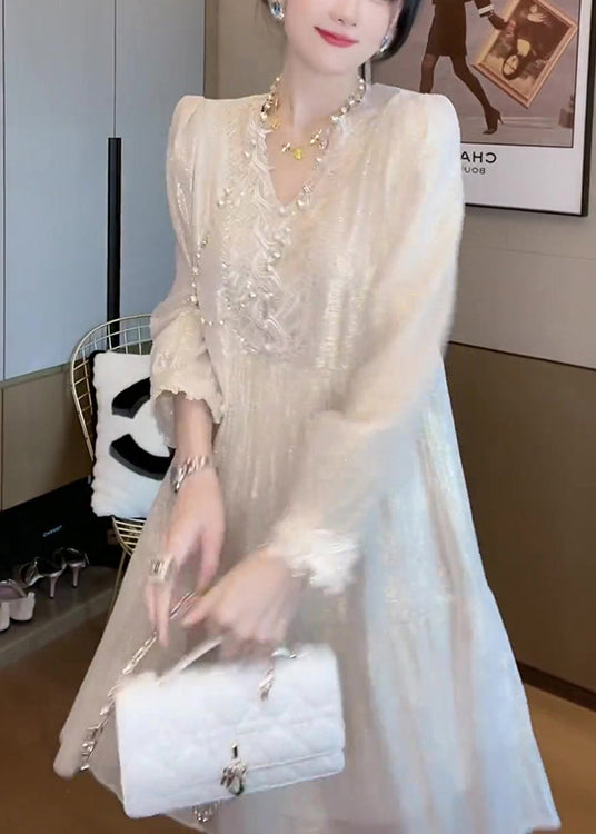 Boutique Beige V Neck Exra Large Hem Silk Dresses Vestidos Spring