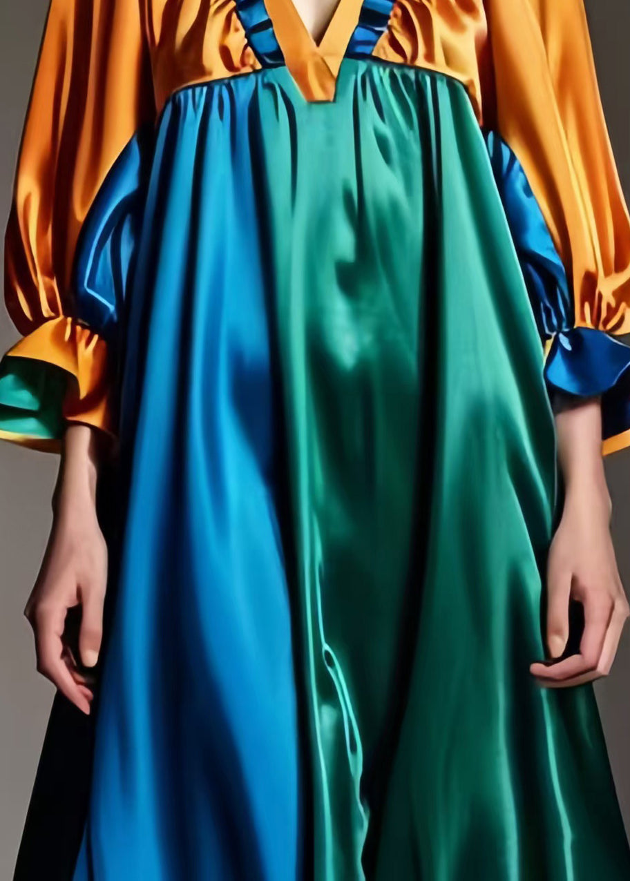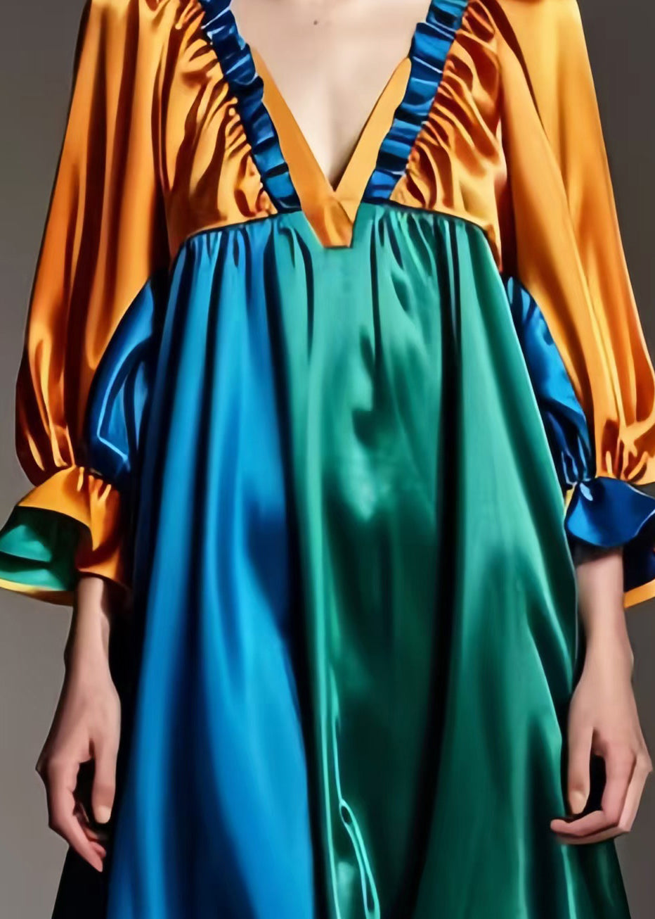 Casual Brown Ruffled Patchwork Draping Silk Dress Spring
