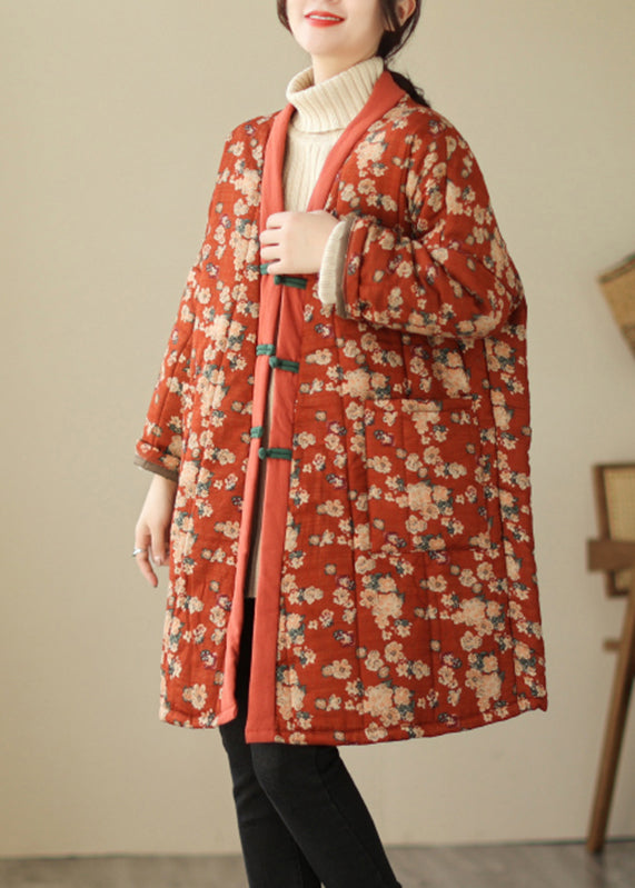 Casual Brown V Neck Print Warm Fleece Thick Long Parka Long Sleeve