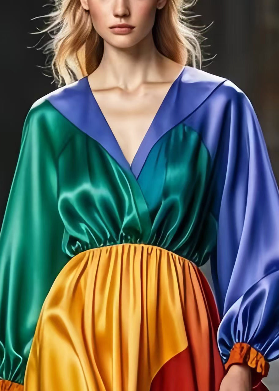 Casual Colorblock V Neck Patchwork Silk Long Dress Spring
