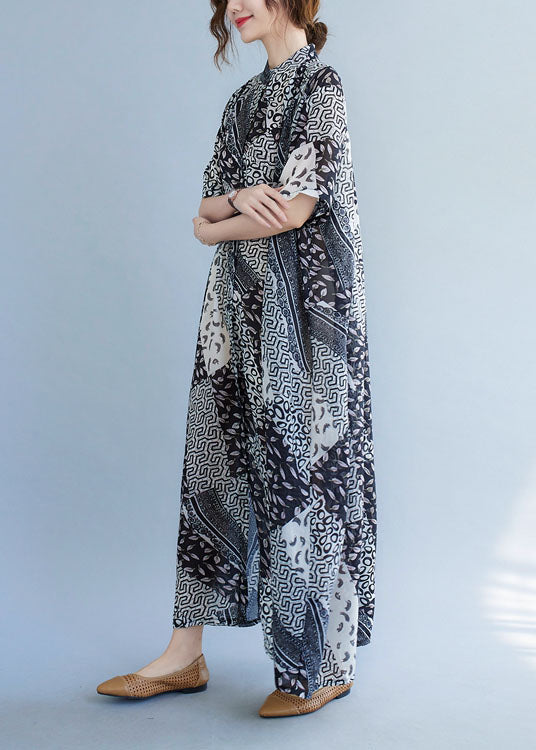 Classy Black Stand Collar Exra Large Hem Print Shirt Dress Short Sleeve