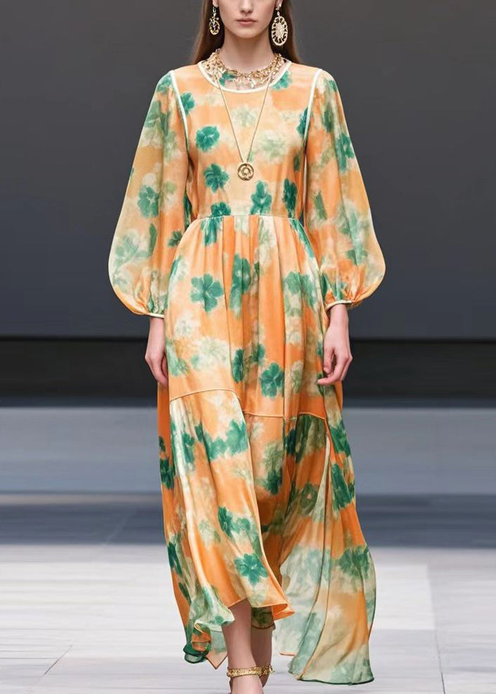 Elegant Orange Print Exra Large Hem Chiffon Long Dress Fall