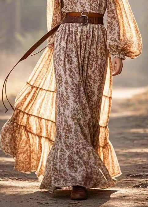 Fashion Khaki Cinched Print Cotton Vacation Dresses Lantern Sleeve