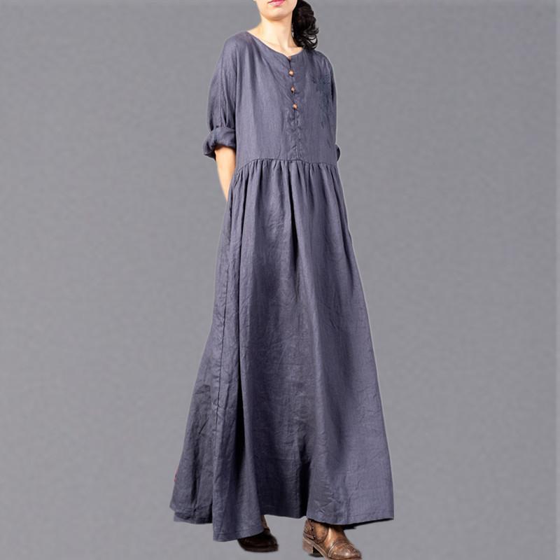 Fine gray embroidery long linen dresses plus size O neck gown 2018 Cinched linen caftans