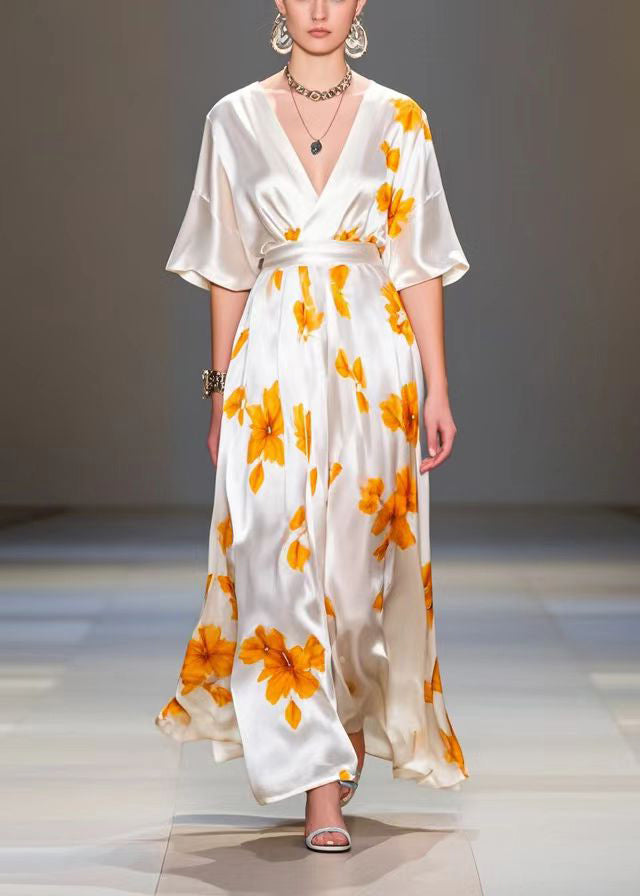 Fitted White V Neck Print Silk Ankle Dress Summer