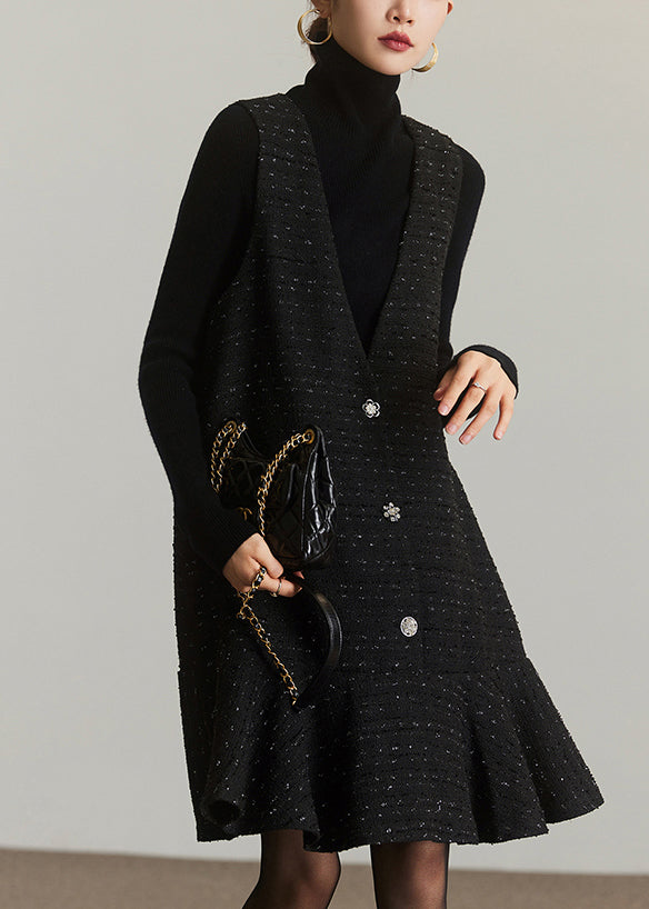 French Black V Neck Button Patchwork Cotton Mid Dress Sleeveless