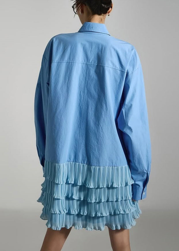 French Blue Peter Pan Collar Wrinkled Patchwork Cotton Mid Dress Spring