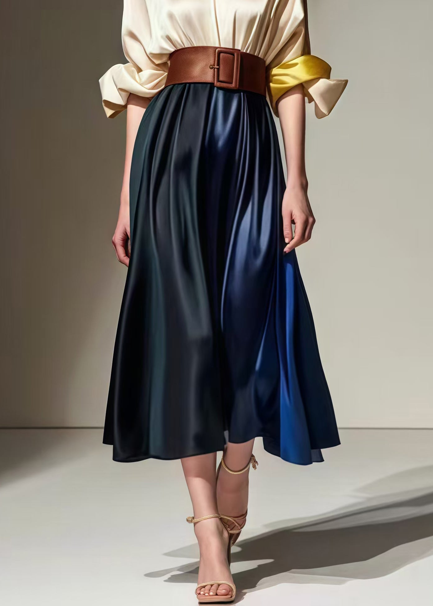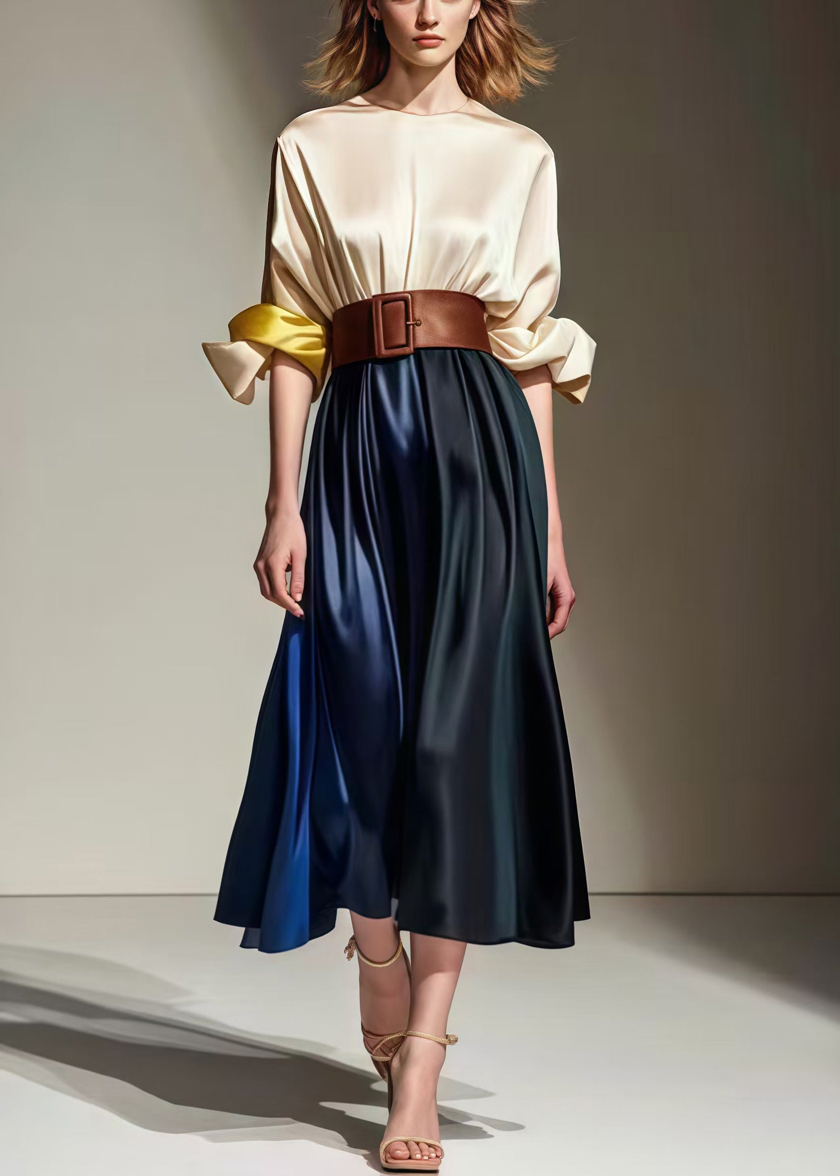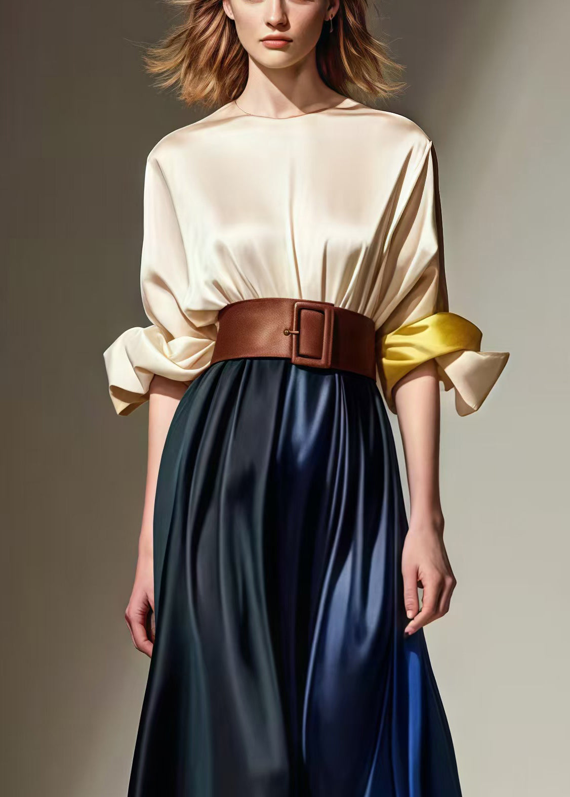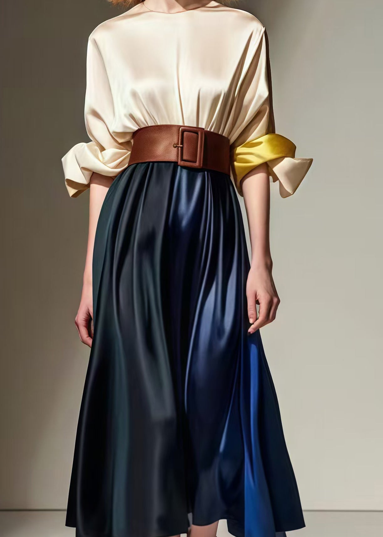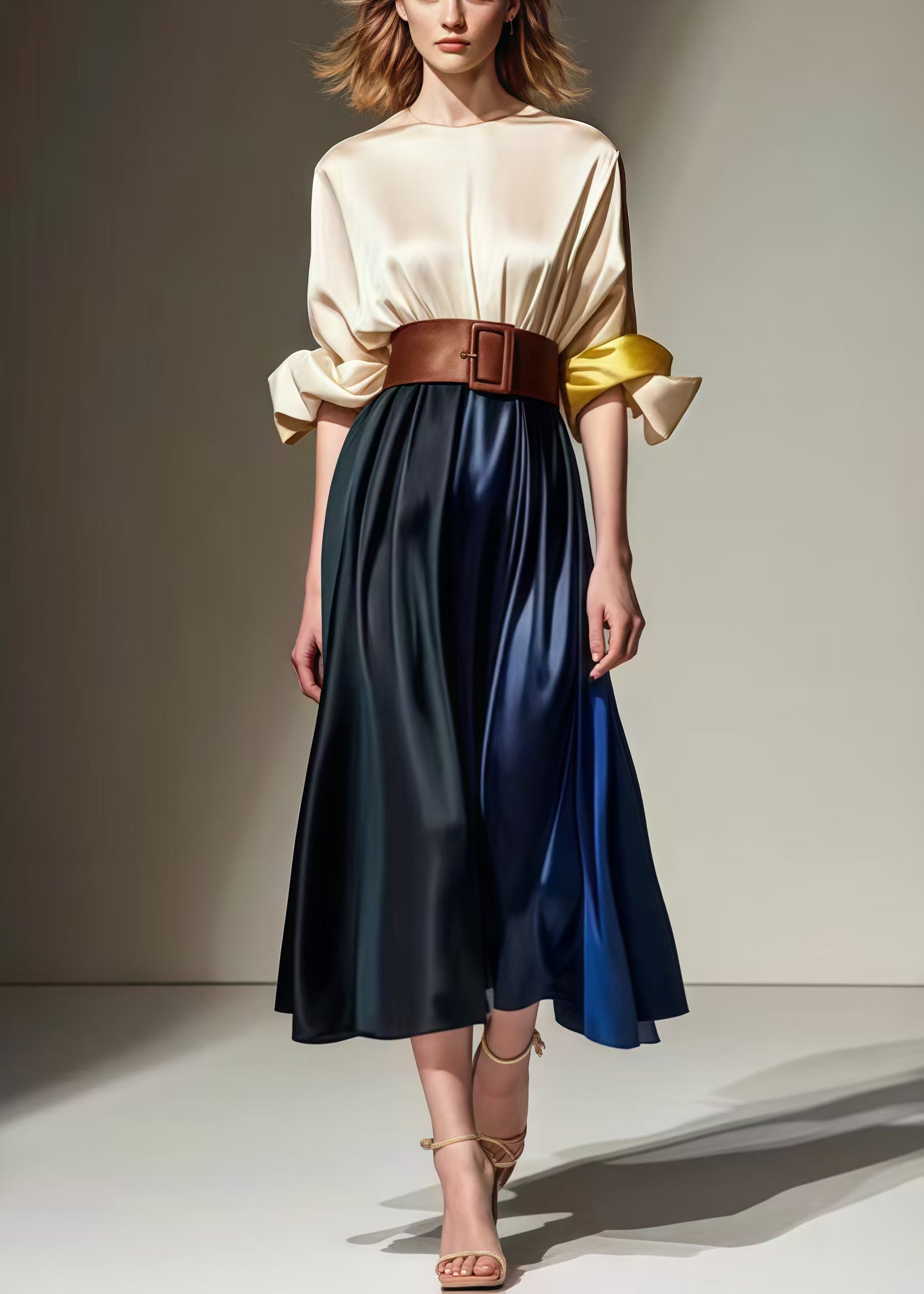 French Khaki Cinched Patchwork Silk Holiday Dress Spring