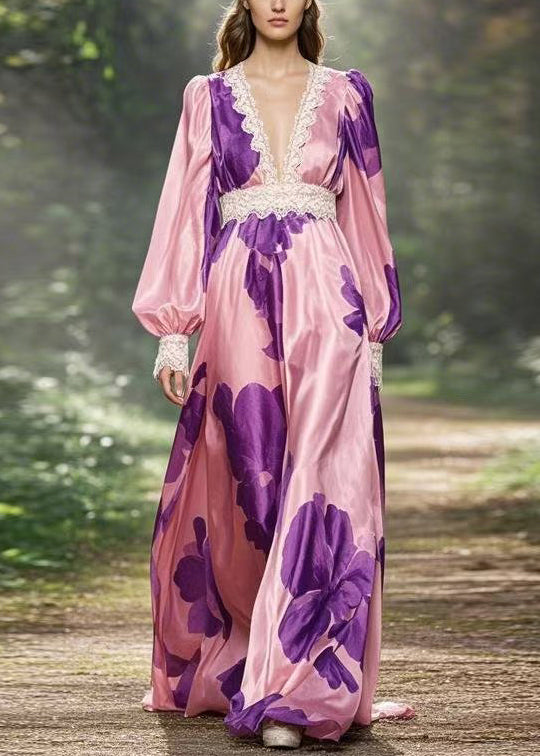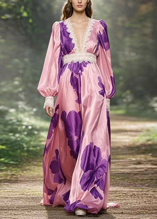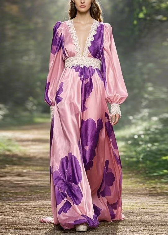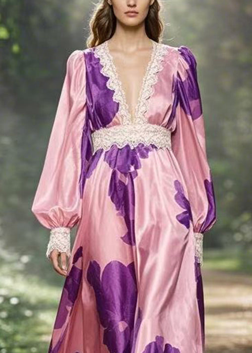 French Pink V Neck Print High Waist Silk Ankle Dress Spring