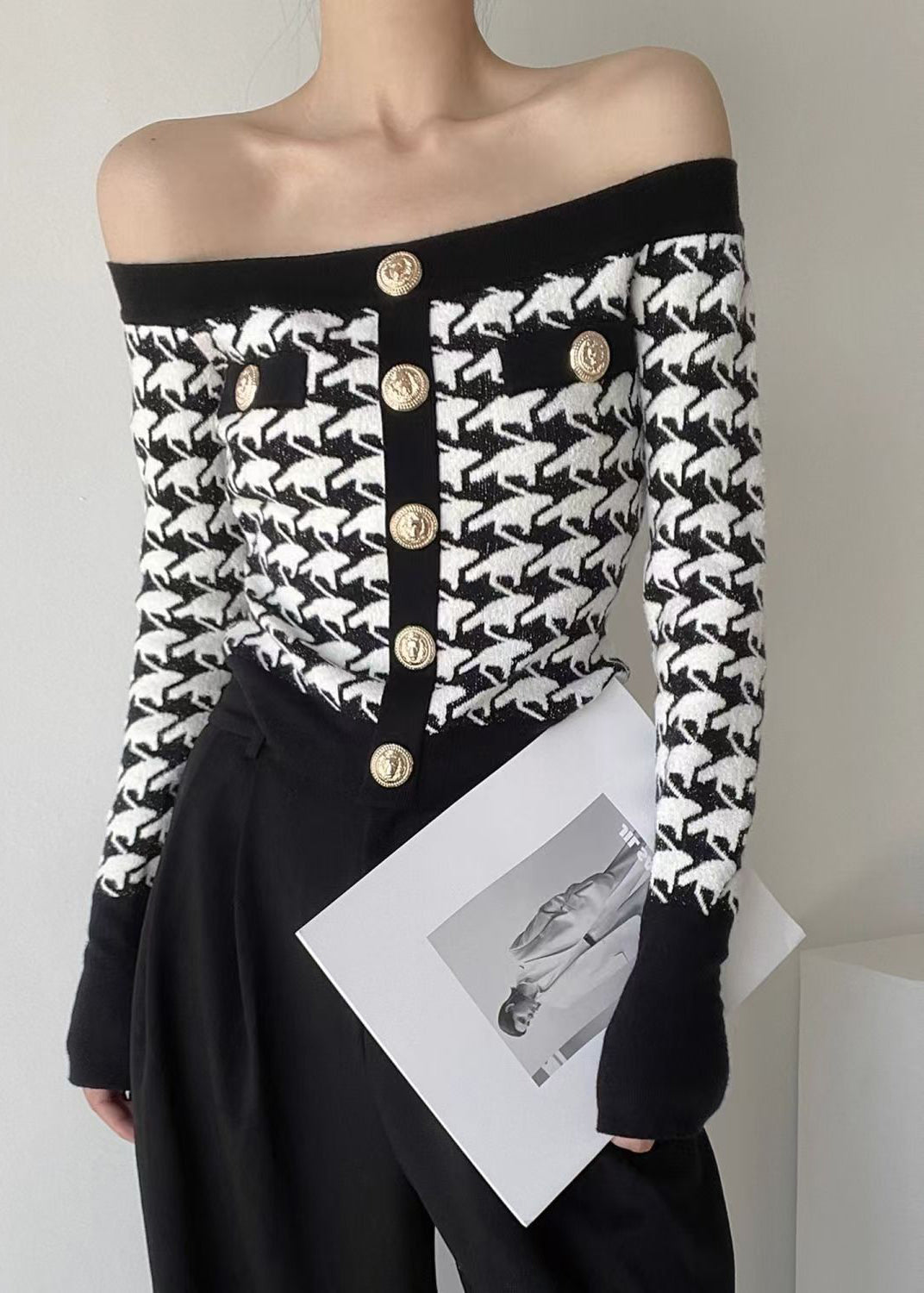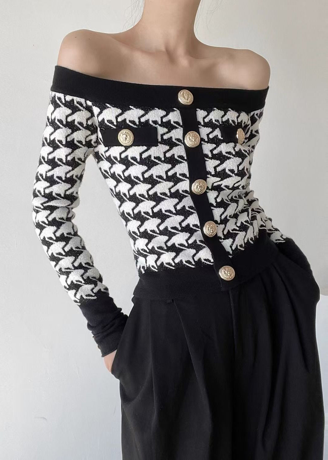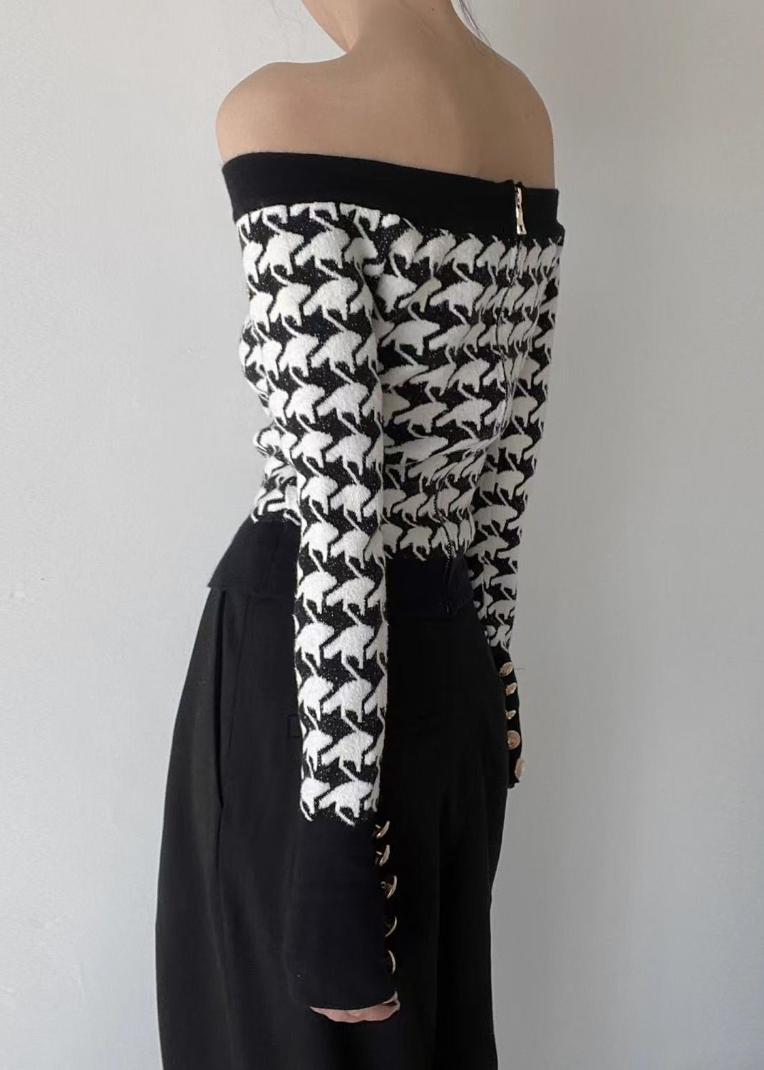 French Plaid Slash Neck Cold Shoulder Woolen Sweater Spring