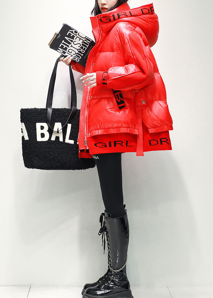 French Red Zip Up Pockets Patchwork Duck Down Puffer Jacket Winter