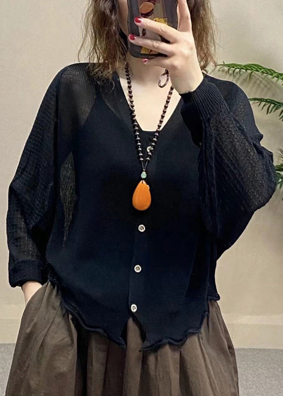 French Rose V Neck Button Ice Silk Knit Top Long Sleeve