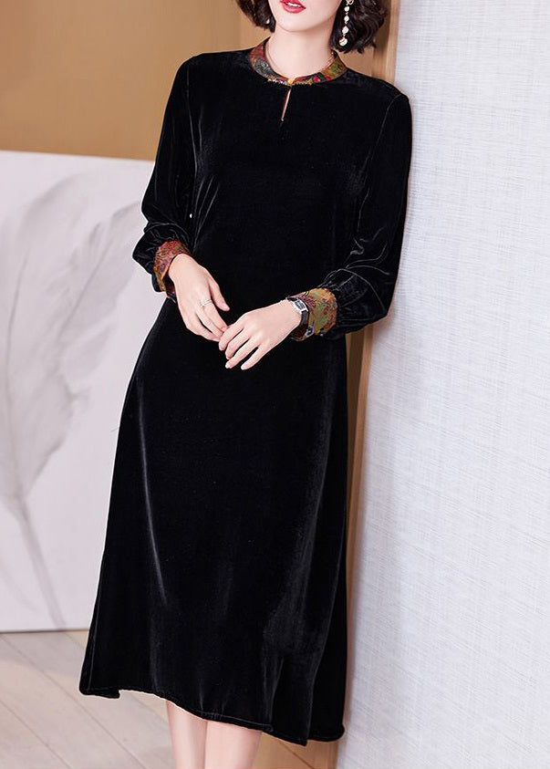 French Wine Red O-Neck Pockets Silk Velour Dress Spring