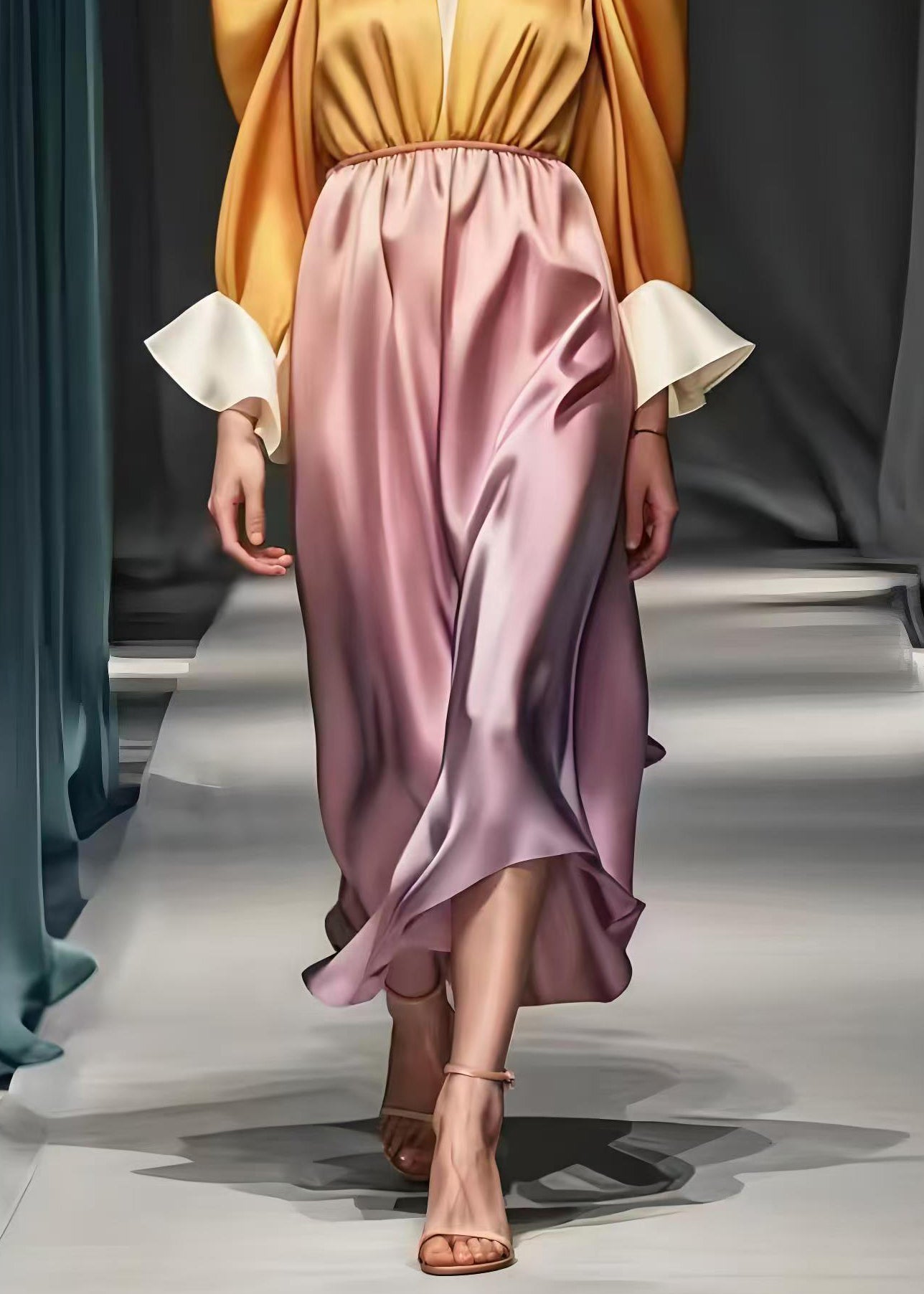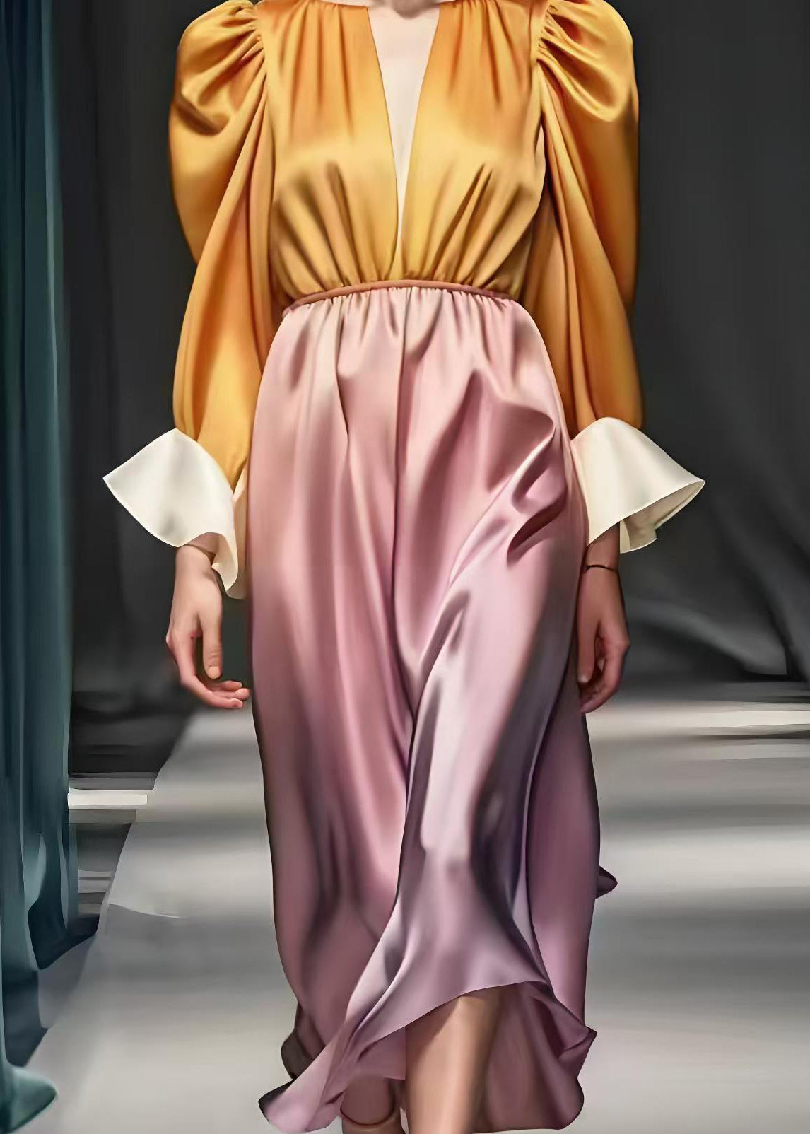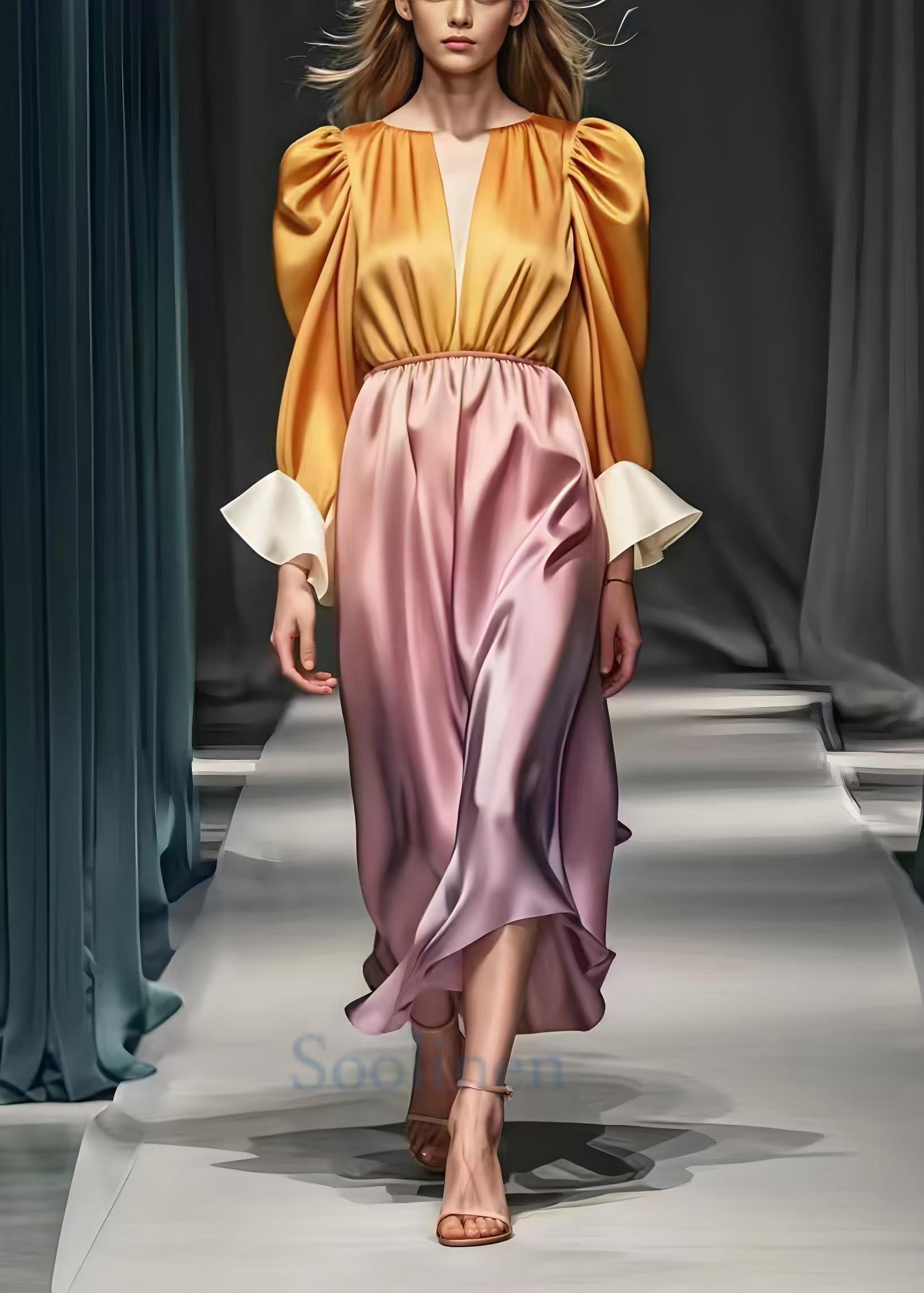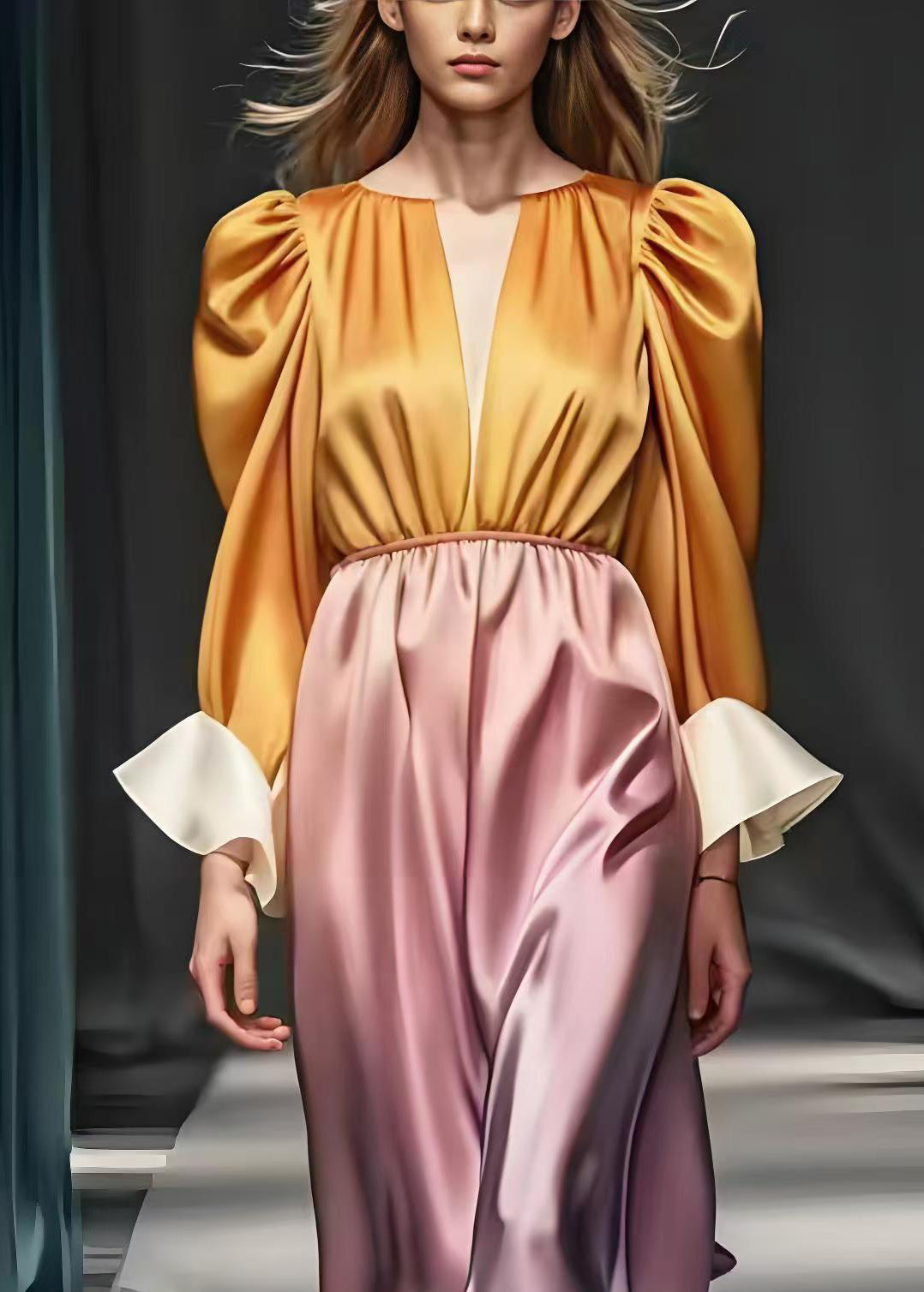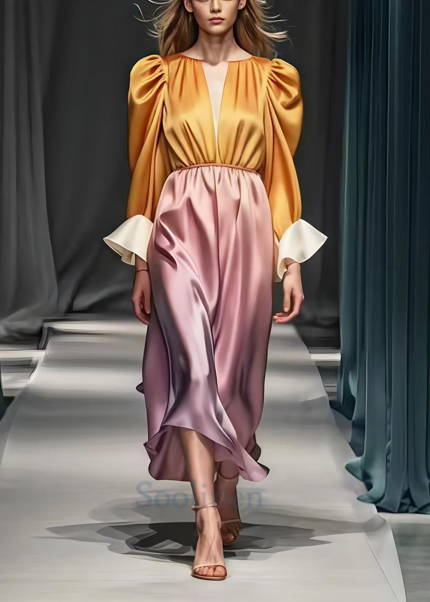 French Yellow Puff Sleeve Patchwork Silk Vestidos Dress Spring