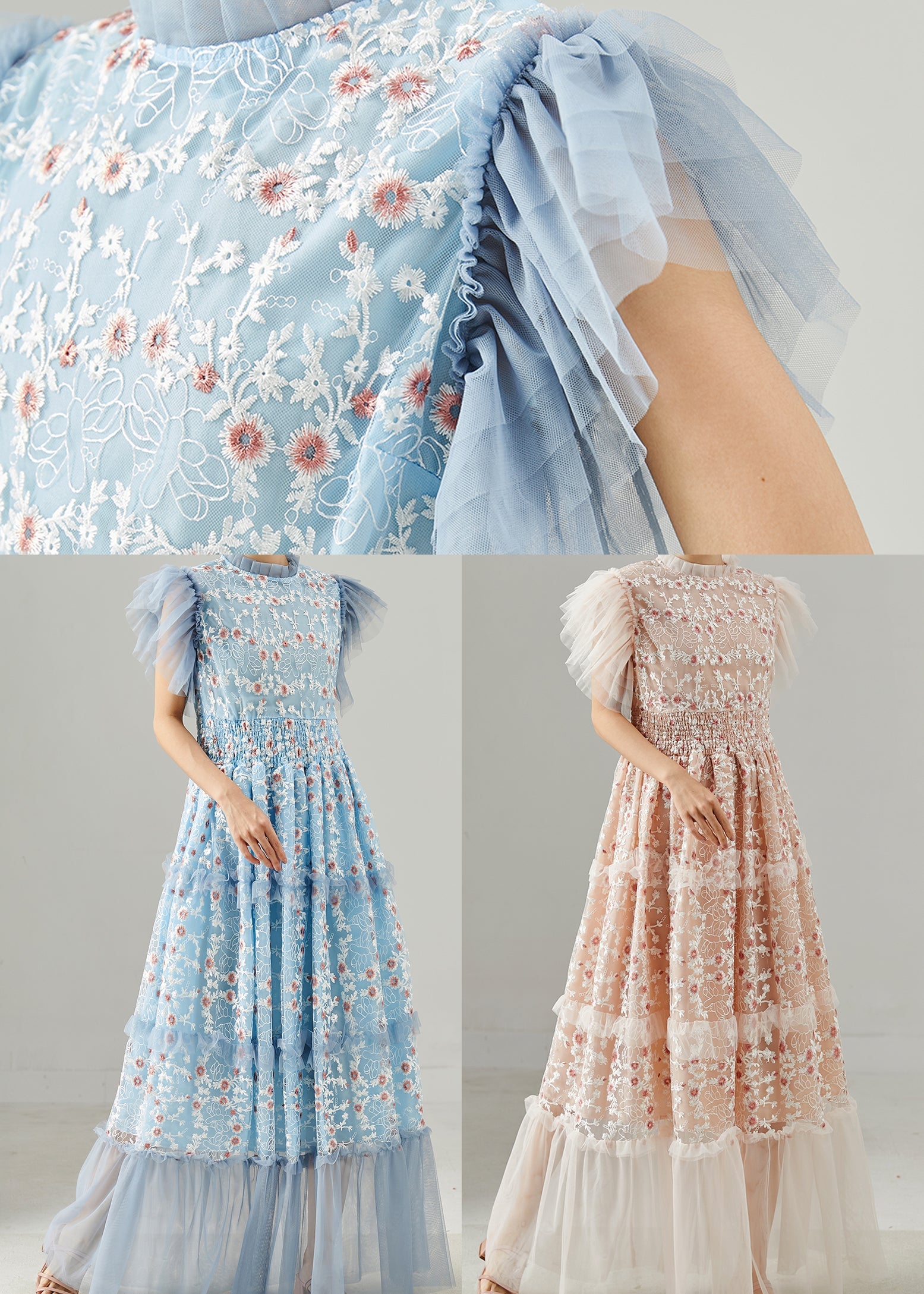 Handmade Blue Embroidered Patchwork Tulle Dress Summer