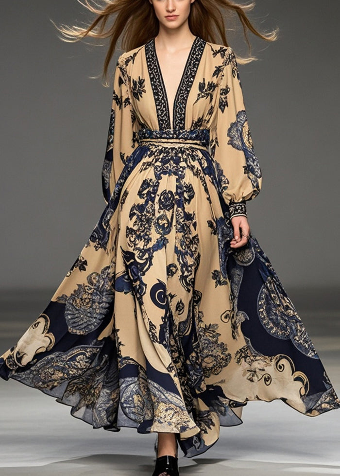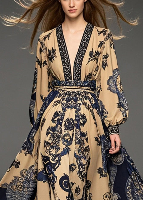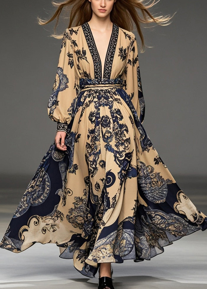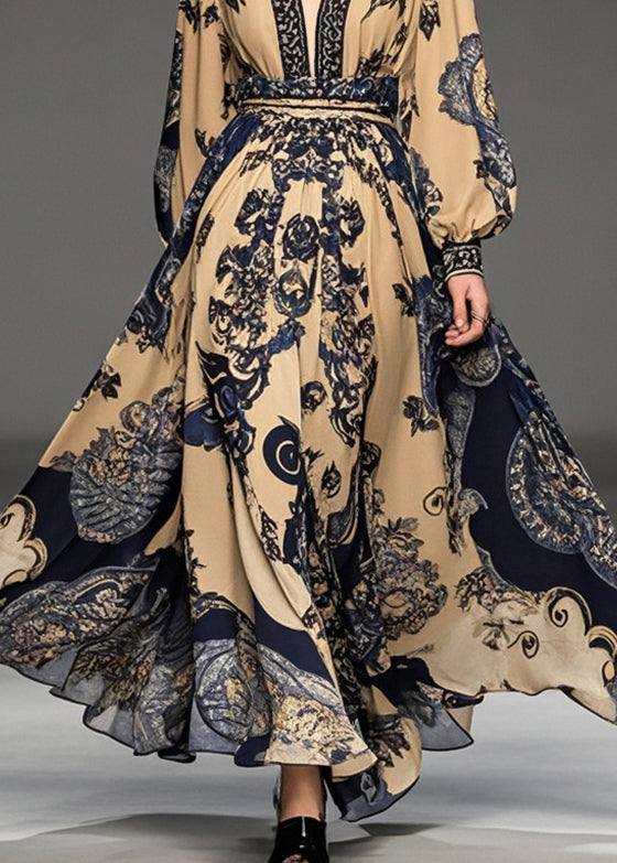 Handmade Brown Cinched Print Exra Large Hem Chiffon Ankle Dress Spring