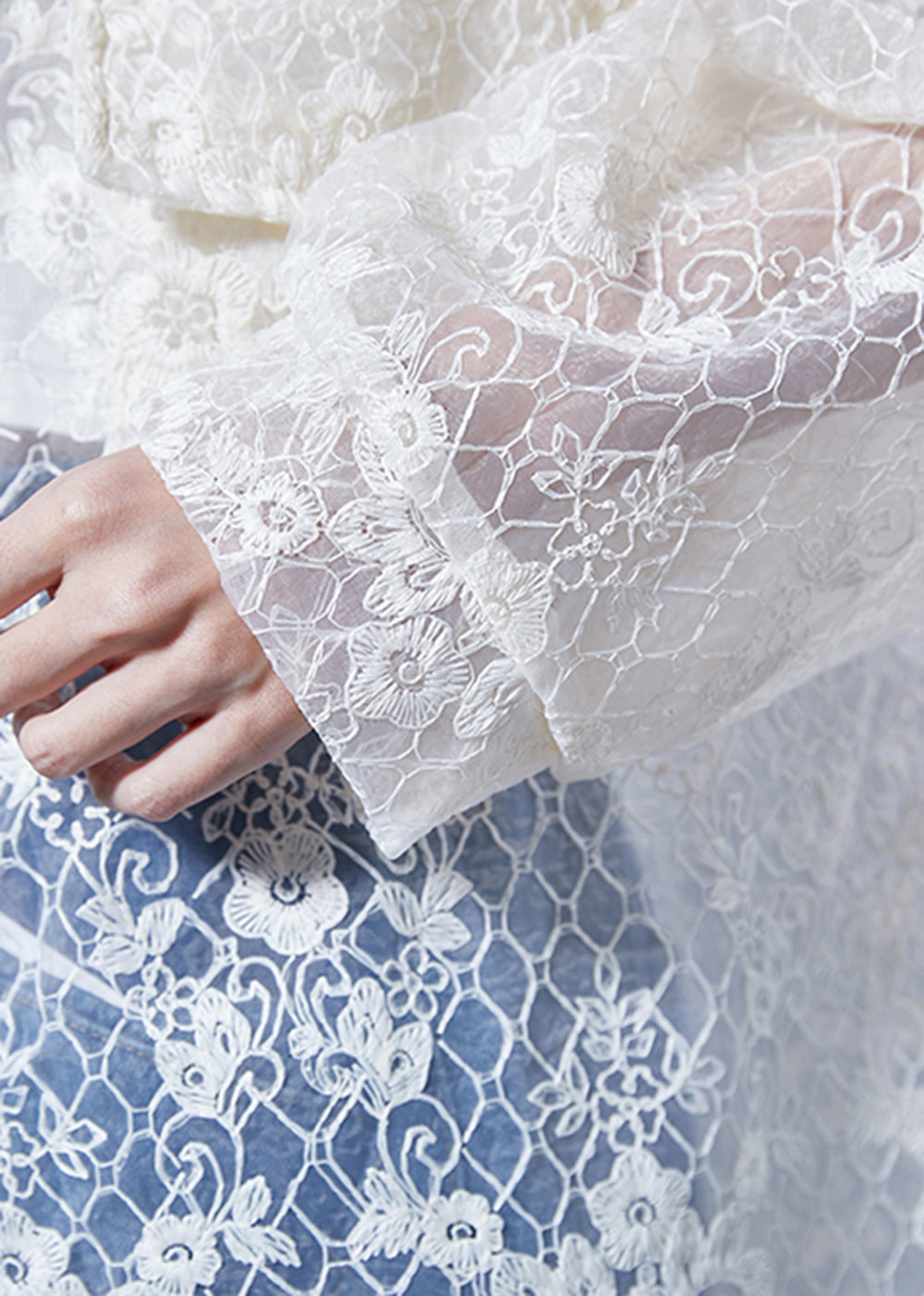 Italian Beige Hooded Embroideried Hollow Out Tulle Cardigans Summer